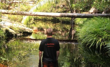 W upale docieramy do wodospadu. Woda spada z dwudziestometrowej skały, tworząc swoiste naturalne spa. Wyrzeźbione strumieniem kamienie mają kształt ławek, które zapraszają „usiądź na nas, śmiało!”. Dajemy skusić się i zażywamy chłodzącego masażu szyi i ramion. Ach, jak przyjemnie! Bez kontrolowania upływającego czasu, pluskamy się w chłodnej wodzie, doświadczając orzeźwienia i głębokiego odpoczynku.